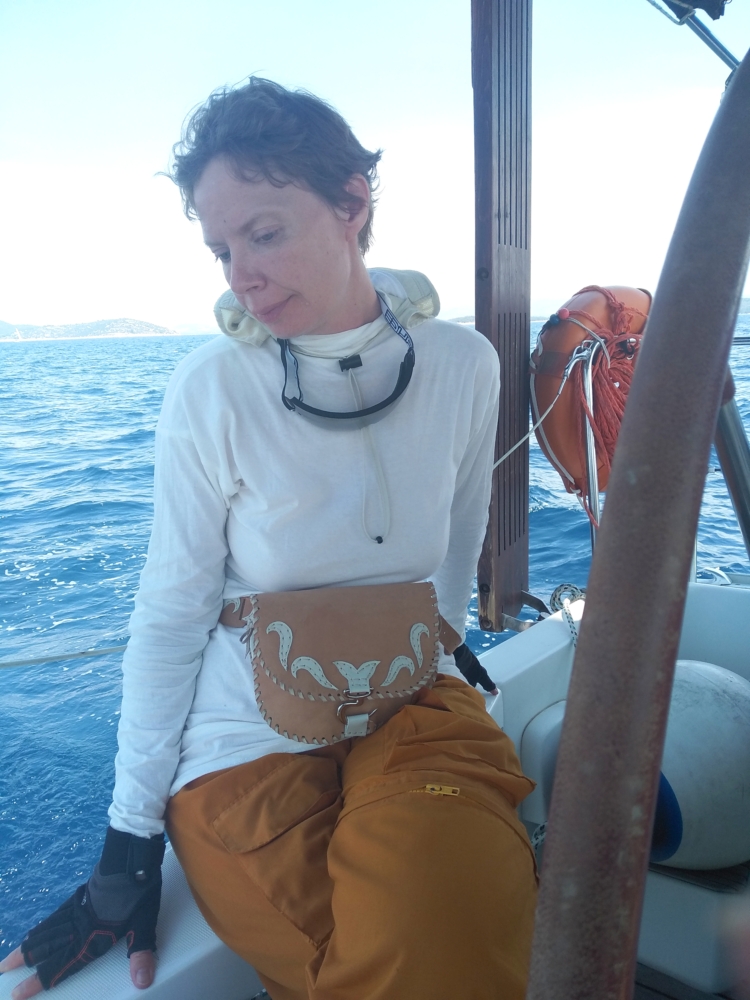 Ветра не было совсем, вода была как стекло. Поэтому сперва шли на моторе и чуть не уснули. Когда все спокойно и ничего не происходит, начинает хотеться спать. Но нельзя! Обязательно нужен впередсмотрящий, даже если включен автопилот. Помимо других судов, в море попадаются сети, их видно совсем с небольшого расстояния, надо бдить. Но Оля сварила нам кофе, и стало легче. А к полудню раздуло и мы поехали бабочкой.