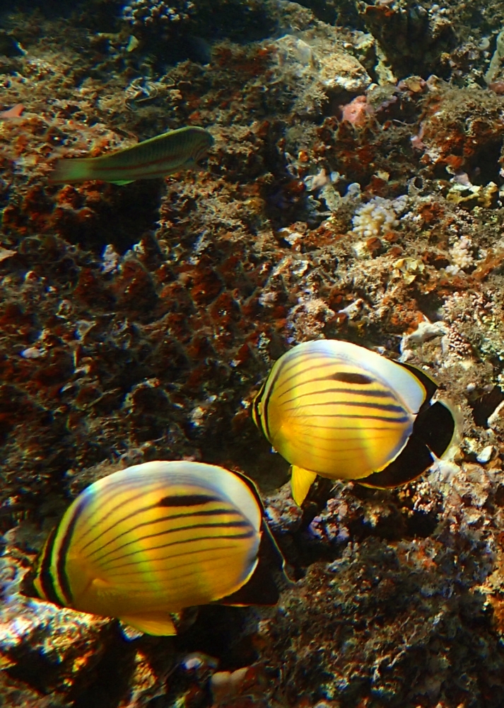 Она фотогенично и спокойно плавает боком. Не то, что шевронная рыба-бабочка над ней, которая уже просто не знает, как ей извернуться :-))
