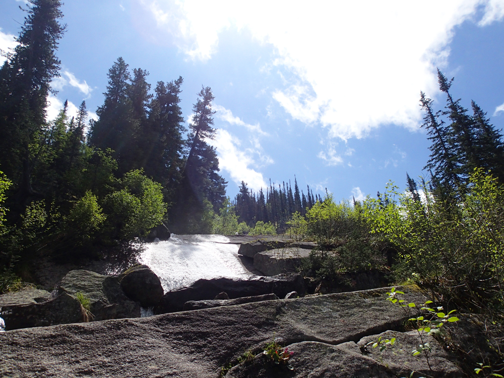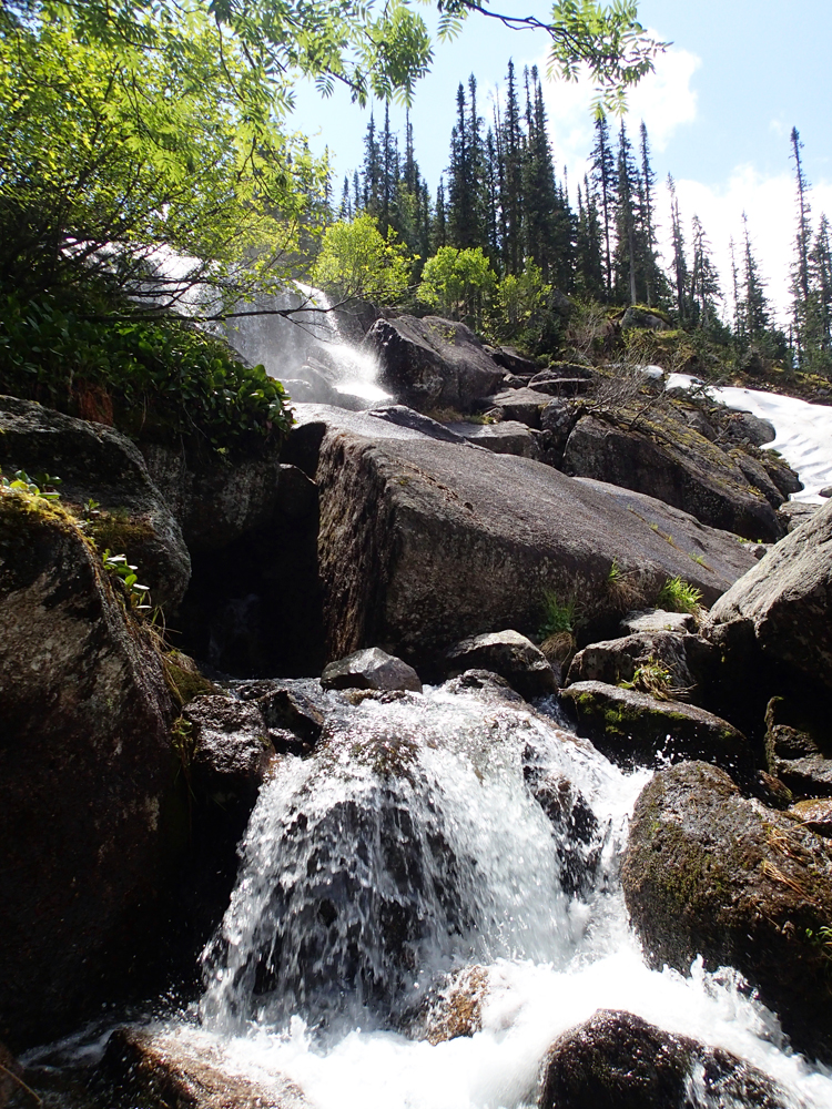 А мы помочили ноги, перекусили и стали подниматься наверх. Выше озера Художников тоже есть несколько водопадов, а вытекают они все из озера Горных духов.