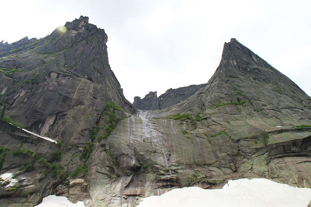 Сперва мы планировали подняться выше до озера Восьмерка, но тучи сгустились, вдали загрохотало. Пока мы сидели под кедром и жевали свой обед, из-за перевала на нас понеслось угрожающего вида облако. Мы выбрали "чемодан" с карнизом, забились под него и переждали основной грозовой заряд. После того, как ливень перешел в слабый дождь, можно было спускаться вниз.