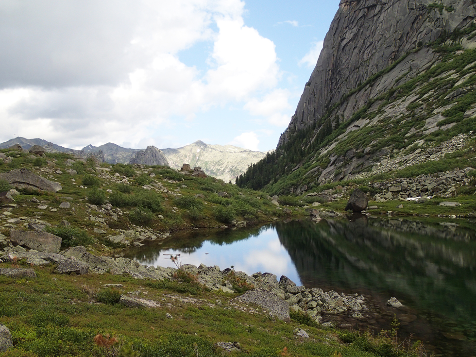 Переждав дождь, мы спустились к Тайгишу, взяли рюкзаки и стали подниматься к озеру Художников. Если бы погода была ясная, мы бы пошли ночевать на озеро Горных духов. Но тучки создавали неопределенность, и сидеть в сырости и тумане не хотелось. Оттого мы опять встали на озере Художников, только в этот раз на его восточном берегу, поближе к тропе на Птицу.