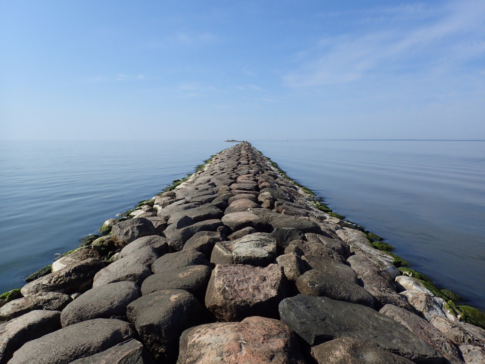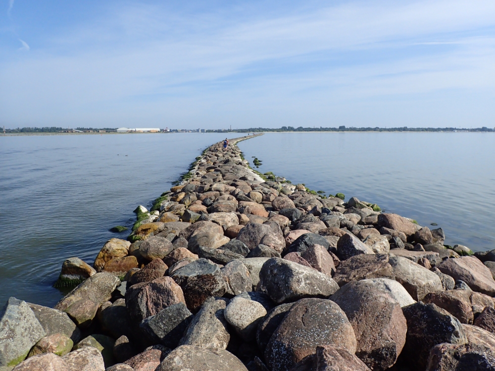 Справа вода условно пресная, если нет нагонных ветров, слева — условно соленая, но разница невелика. Справа для судов прокопан фарватер. Мол затем и нужен, чтобы оставалась хоть какая-то глубина и песок не заметал выход в море.
