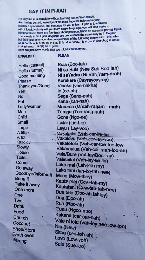 Реально кроме «Bula!» и «vinaka» туристам особо ничего не нужно знать. Потому что фиджийцы хорошо говорят на английском — внятно и просто. Но зато особенности топонимов и произношение некоторых звуков проясняется. Nadi — это Нанди, а Mamanuca — вовсе не Маманука, а Мамануса: 'c' — глухой межзубный согласный типа θ.