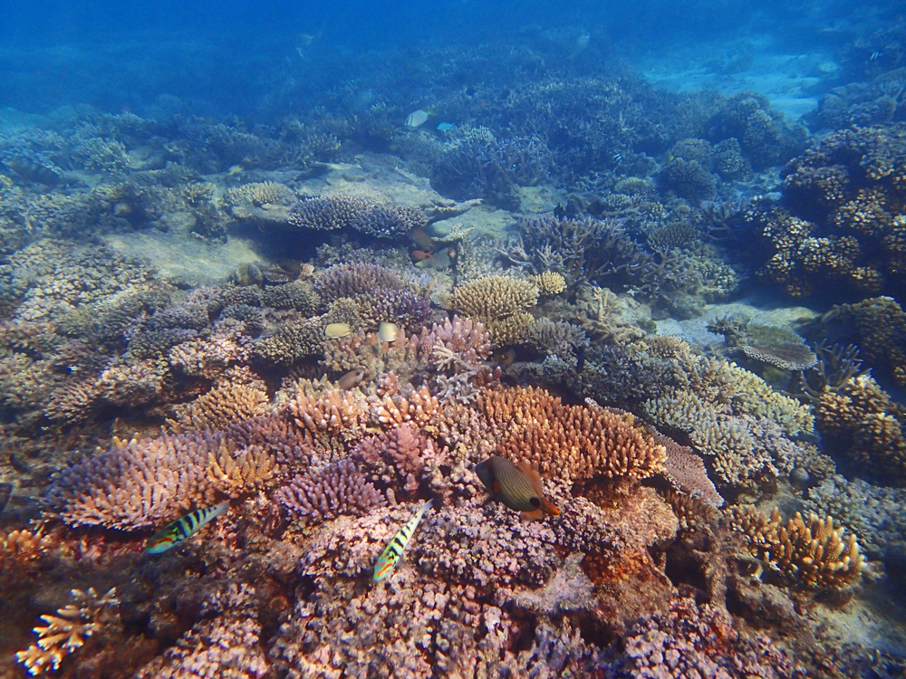 На второй день мы выяснили, что перед ресортом есть замечательный коралловый риф. Самый яркий и красивый из всех, что нам встретились за этот месяц. Плавать там можно было только во время прилива, в отлив становилось очень мелко.