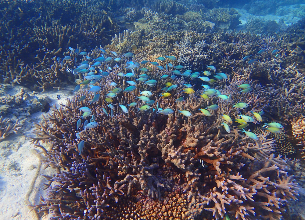 Некоторые рыбки настолько яркие, что похожи на мультяшных. Под рыбками мягкий коралл, который смешно колышется в воде.