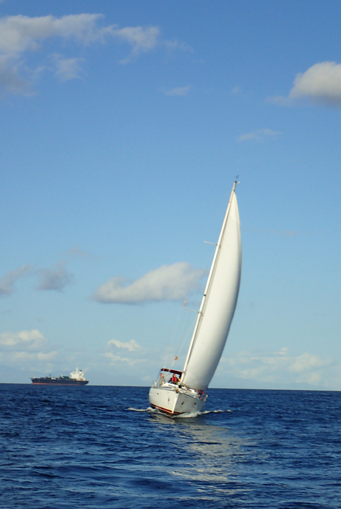 Ветер был попутный, а вот течение нас уже тормозило. Зону разделения движения прошли довольно мирно. Это такая полоса в море, где двигаются большие суда и где нам лучше не путаться у них под носом. Контейнеровозы и паромы ходят гораздо быстрее нас. Здесь мы посмотрели на то, как изменчив пролив — где-то волны, где-то стоячая волна, где-то противоборствующие течения.
