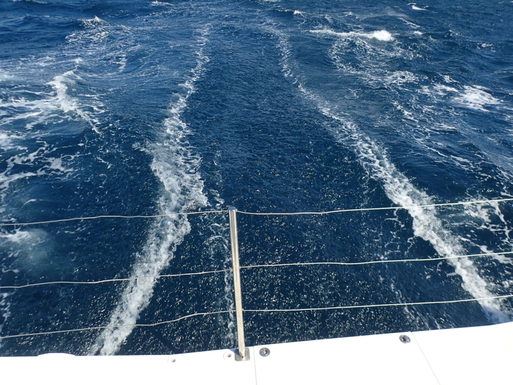А идем мы на нём очень даже быстро. Вот это 9 узлов, кильватерная струя отстает от нас.