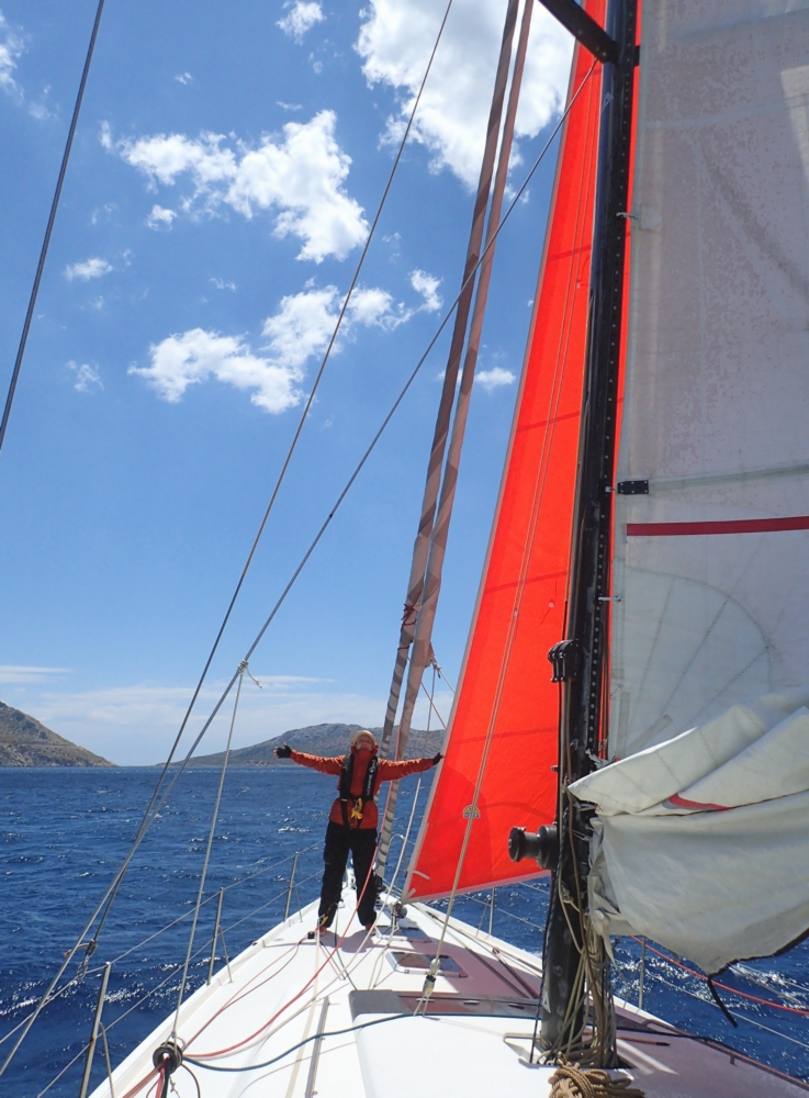 Установили штормовой стаксель. Он у нас ярко-красный, штормовые паруса часто делают такими яркими.