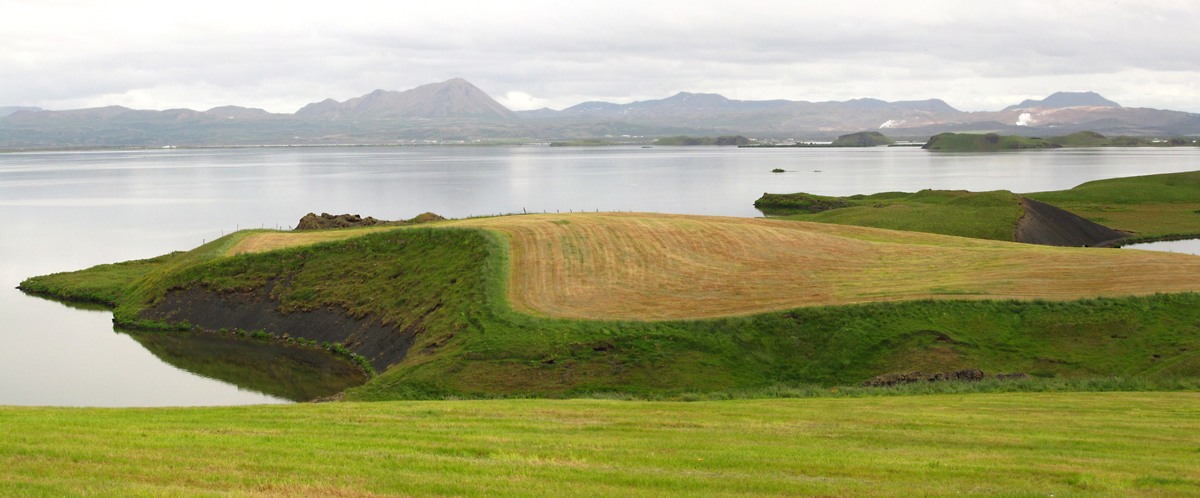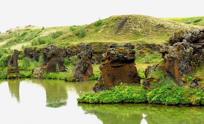 Эта область называется Skútustaðir и характерна поросшими травой кратерами. Некоторые стоят на берегу, некоторые поднимаются из воды.