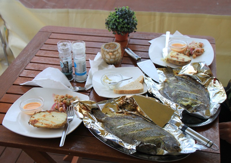 Обедать единственный раз за поездку пошли в ресторанчик на пристани. Там случился комплексный обед за 2500 крон и мы решили - надо брать. Сперва был рыбный суп, а потом вот такая очень вкусная рыба, поджаренная на гриле с картофелем: