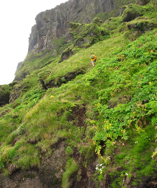 Справа от поселка побережье достаточно крутое и поросло зеленью. Вообще мы не хотели приключений: после горячей ванны и в тапочках, без треккинговых палок не очень хочется скакать по утесам. Решили взобраться совсем чуть-чуть, чтобы посмотреть сверху на поселок. Ну и как обычно - понеслось...