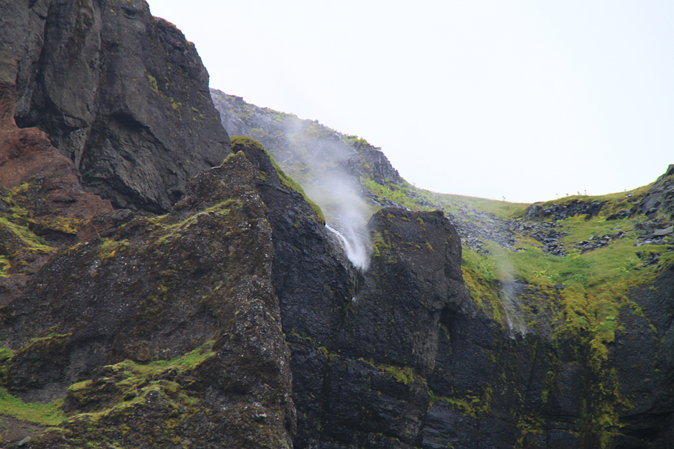 Два года назад мы проезжали здесь в песчаную бурю, возвращаясь из парка Скафтафетль. С изумлением увидели тогда водопад, текущий вверх, но из окна автобуса сфотографировать его, конечно, не успели.