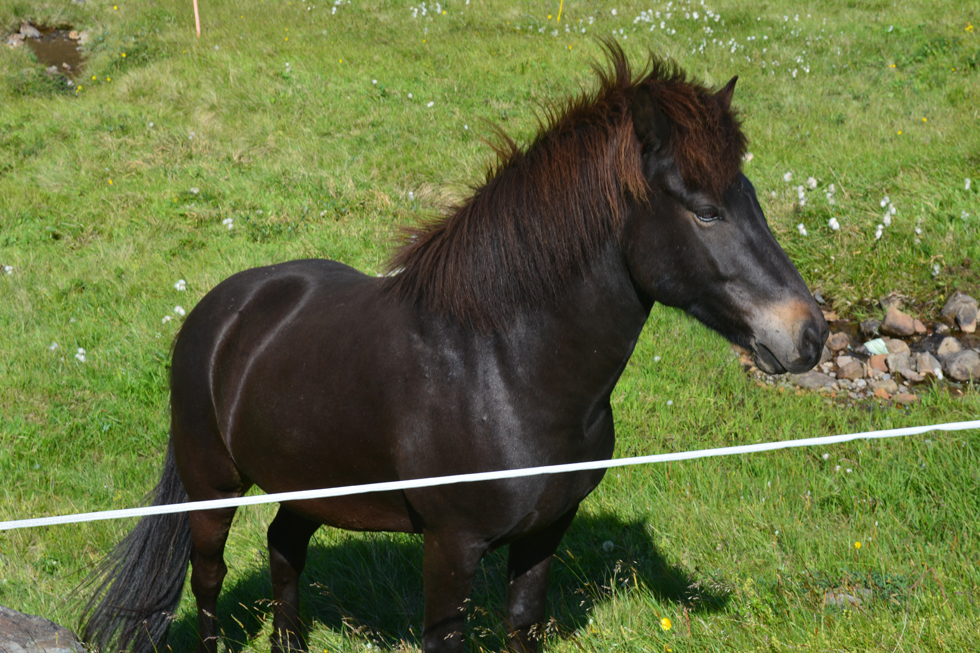 Зато кони оказались совершенно ручными и общительными. Вот этот вороной жеребчик был огорожен индивидуальным загончиком из ленты под слабым напряжением. Мы угостили его яблоком.