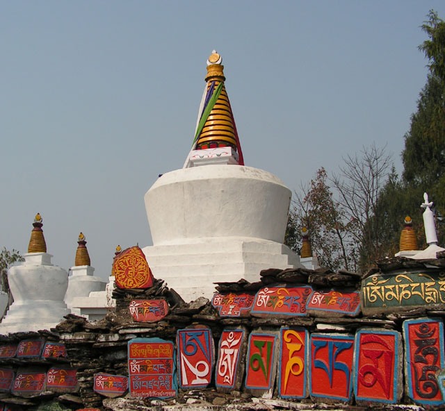 Вокруг монастыря множество камней, на который выбиты мантры и изображения будд и боддхисаттв. И вообще там есть традиция: можно купить каменную табличку с мантрой, посвятить ее близкому человеку и поставить рядом с другими такими же. Со временем старые таблички складывают и закрашивают побелкой, и они становятся стеной, к которой прислоняются новые таблички.