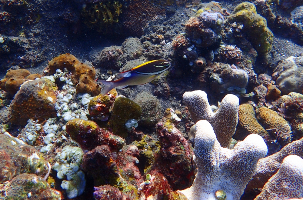 Тут есть и рыбки, и заявленные кораллы, растущие на черном вулканическом песке.