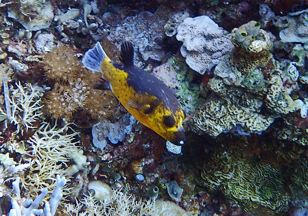 Очень забавная рыбка паффер. Ее еще зовут Dogface — «собачья морда». Бывает разных цветов.
