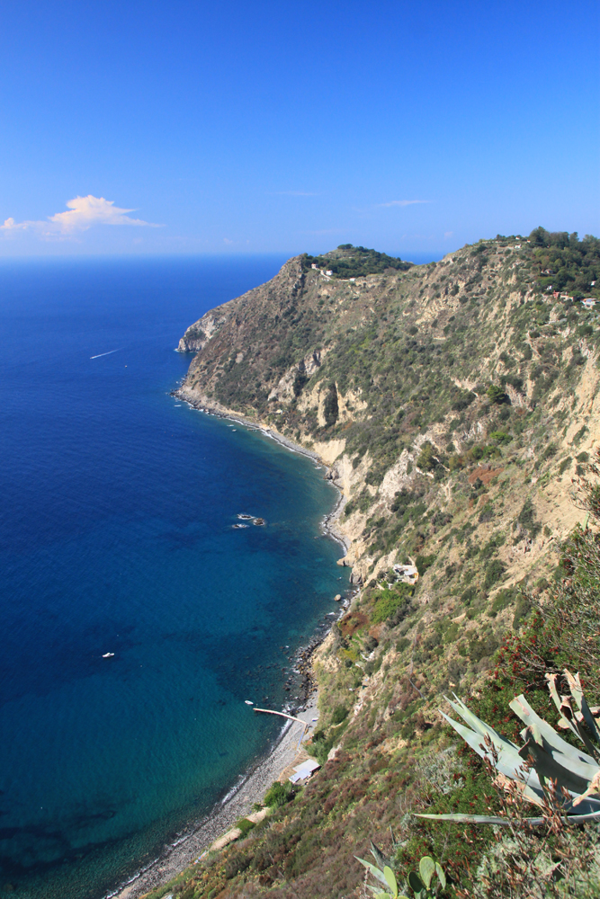 В самом поселке указатели звали нас спуститься вниз в какой-то ресторан, я возмутилась и воспротивилась, и мы полезли наверх, теряя дорогу. Залезли в чужой огород, с трудом из него вылезли, обходя изгородь. Но направление выбрано было правильно: дальше дорога идет по лесу, то и дело попадаются обзорные точки: слева виды на Искью, справа — на Арагонский замок.