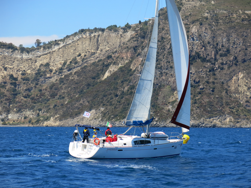 В полдень мы вышли из Сорренто и четыре часа шли под мотором на остров Искья. А там, возле Арагонского замка была мильная гонка вокруг буев. К ней я уже более-менее разобралась, что делать при повороте оверштаг, и в нужный момент тянула за нужные шкоты. Зашитый парус держал!