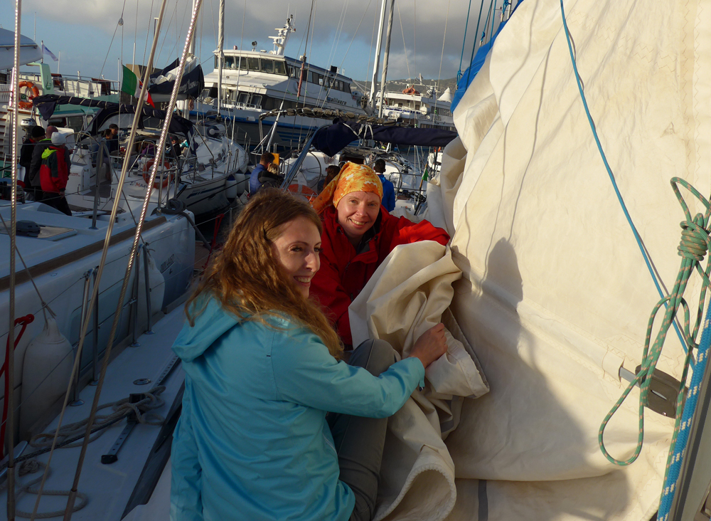 На Капри очень дорого куда-либо встать. В марину мы сами вставать не захотели, а к бую нам пришвартоваться не давали. Я попыталась зашить парус в море, но это было медленно и довольно экстремально, сильно мотало. На ходу парус вынуть из мачты мы не смогли, поэтому шить приходилось стоя, пристегнувшись к мачте. Мы понимали, что не успеваем.