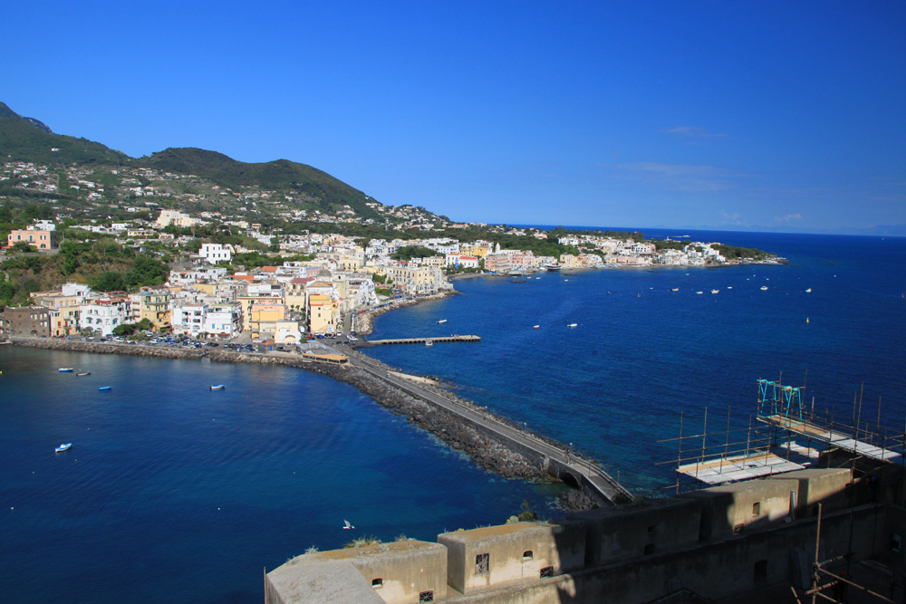 Замок находится на маленьком островке возле Искьи, к нему построен мост.