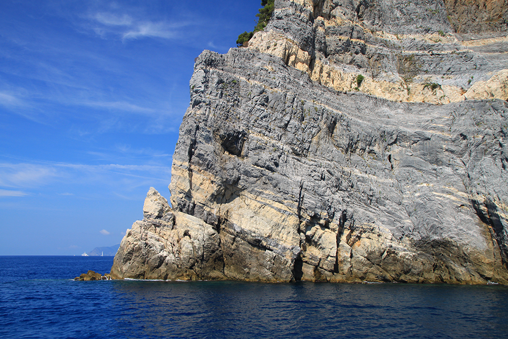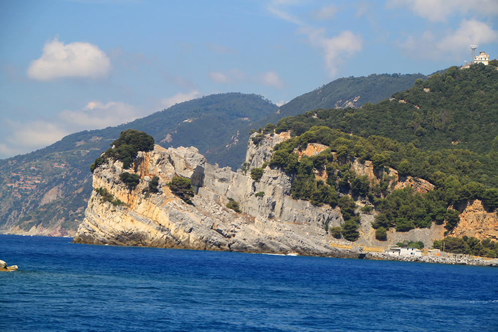 На четвертый день мы решили не ходить больше по жаре, стало тяжеловато. Поэтому мы снова доехали до Портовенере, сели на кораблик с экскурсией вокруг трех островов. Экскурсия стоит 15 евро, отправляется каждый час, продолжительность 45-50 минут. Виды замечательные. Портовенере с воды.