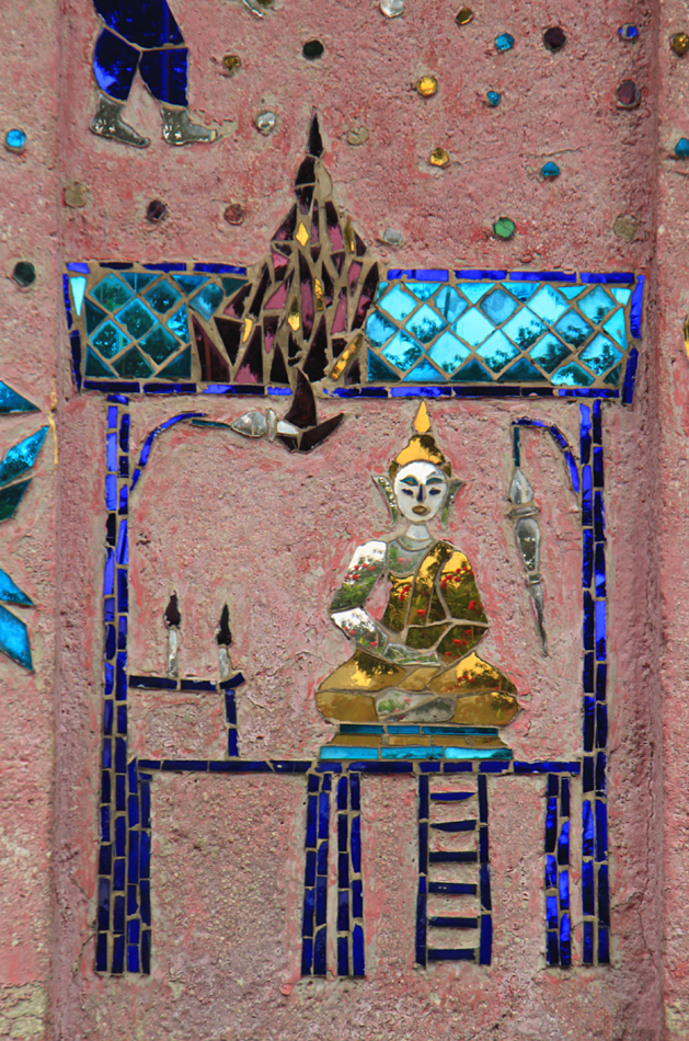 Архитектура похожа на северные тайские храмы. А вот отделка своеобразная — золотой рисунок по основному тону и зеркальная разноцветная мозаика, переливающаяся на солнце.