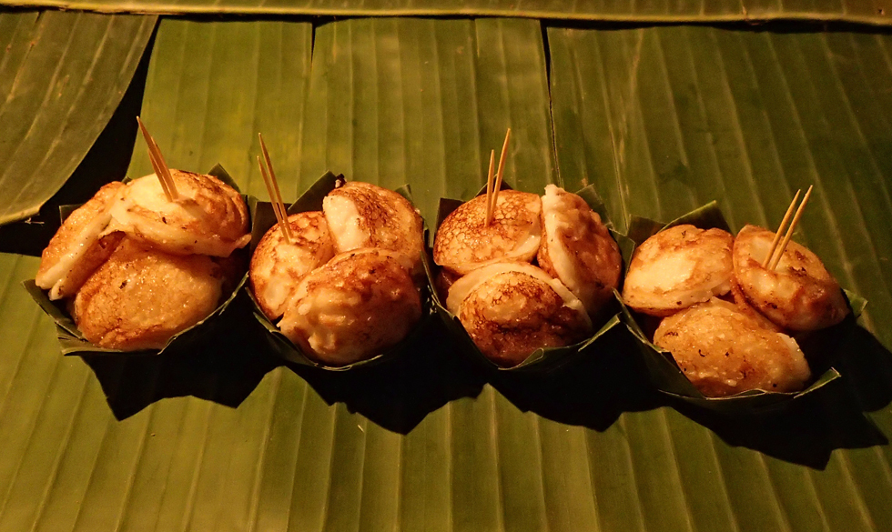 Печется он из жидкого теста, куда входит сахар, кокосовое молоко и, наверное, рисовая мука. Две маленькие полусферы сперва жарятся в форме, а потом соединяются и сервируются в банановый лист.