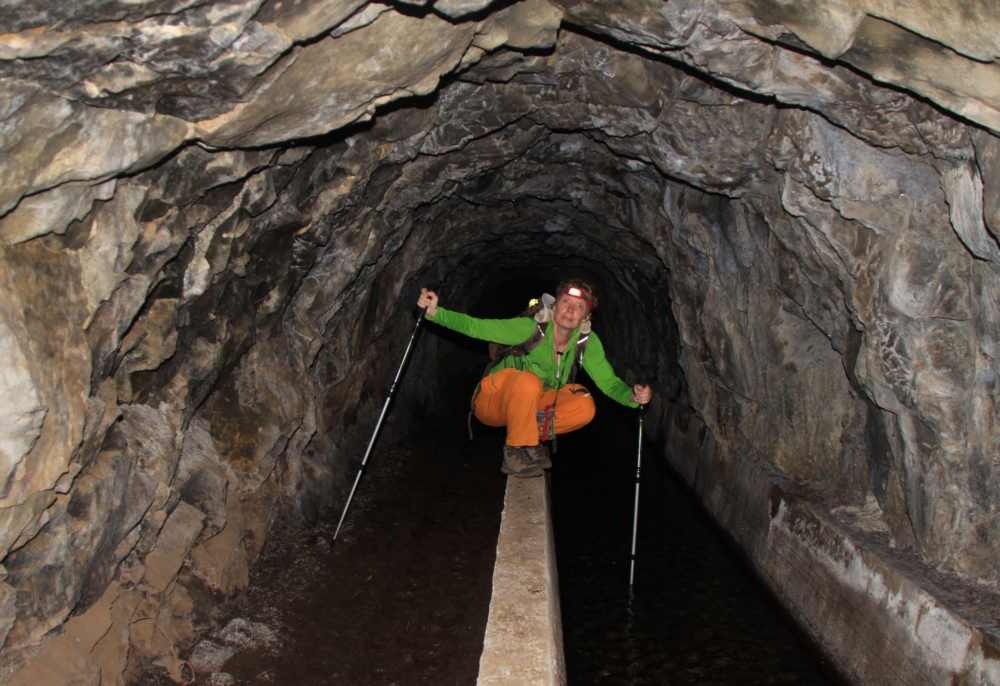 Держусь за палки в мокром тоннеле, вода справа, грязь слева:
