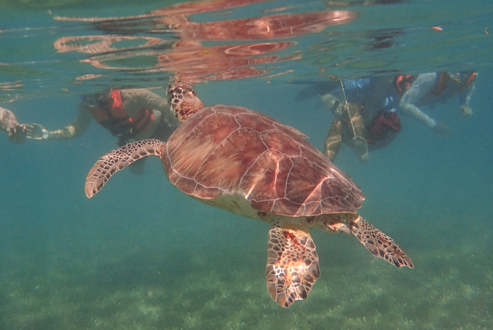 Вольная черепаха в бухте Акумаль и ее восторженные зрители: