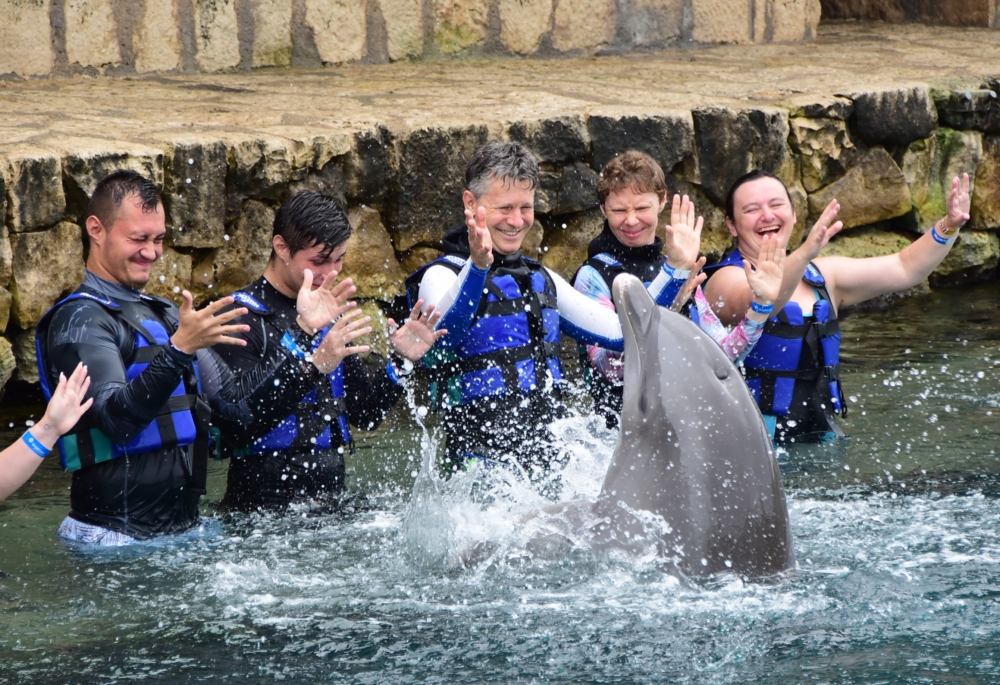 Дельфины в Шкарете живут в просторном морском заливе. Есть несколько программ, мы выбрали ту, где на дельфине можно покататься. По приходу в парк нужно найти какой-нибудь офис, где записывают на определенный сеанс: один сеанс 45 минут. По факту в воду входит группа из 10 человек примерно на полчаса. За эти полчаса каждый по очереди может пообщаться с дельфином и еще есть всякие фокусы, которые делаются для всех.