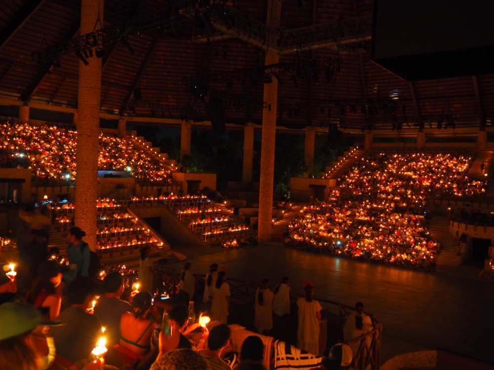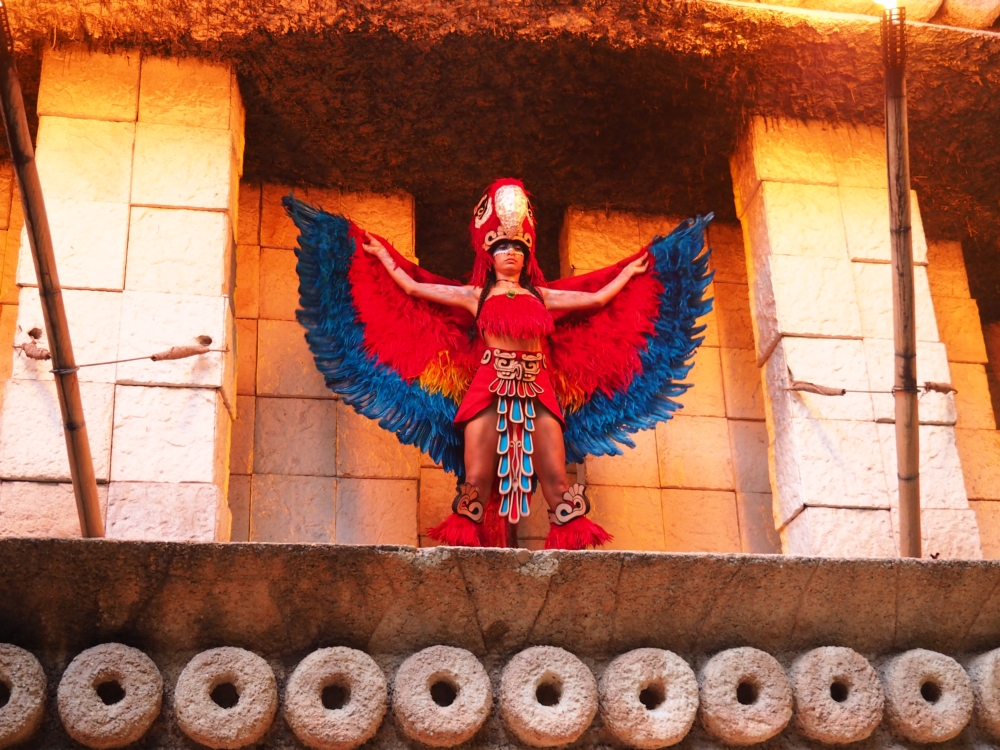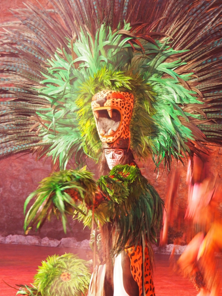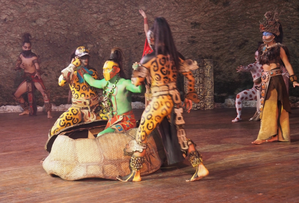 Мы уже потом почитали на сайте парка, что творилось на сцене. Основная идея — рождение кукурузы — была и так понятна. Если в двух словах, то с помощью танца нам рассказали о путешествии бога маиса Хун Нал Йе в подземный мир (Шибальбу) в сопровождении бога смерти Ах Пуч и божественных близнецов-героев Хунахпху и Шбаламке. Множество жрецов и потусторонних существ участвуют, чтобы выросла свежая и новая кукуруза. Зажигательные танцы происходят под живую музыку — духовые, ударные и просто боевые выкрики оркестра майя.