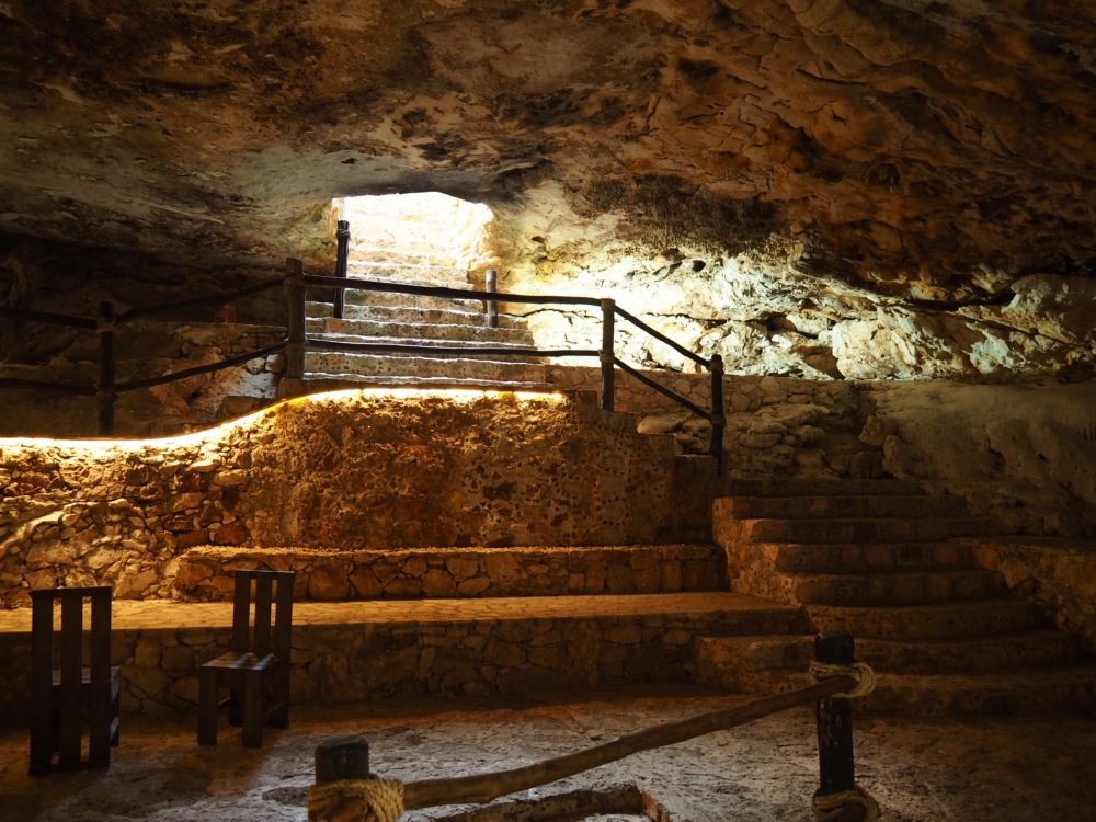 Сенот Вулпоч на месте называется почему-то Хомун-ха. Посещение стоит 70 песо, сенот подземный. Когда мы приехали, не было никого. Но вышел служитель и включил нам свет под землей. Ран почему-то решил остаться в машине, три месяца спустя у меня нет объяснения этому странному факту. А мы с Тиночкой спустились.