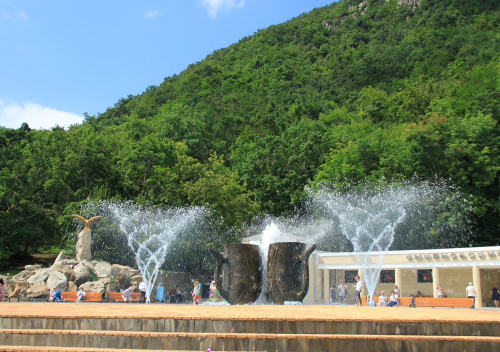 Фонтан с бюветницами и обстановка, вмещающая в себя все фишки региона: Гаруду со змеей, нарзанную галерею, парк, гору...