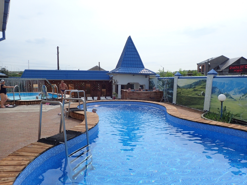 В станице Суворовская два термальных комплекса, находятся они рядом. Есть старый поменьше с синими крышами, есть новый побольше, справа от старого. Цены совершенно одинаковы — 450 рублей в час, причем это честный час в бассейнах, раздевалка не считается. Мы пошли в тот комплекс, который с синими крышами, там почему-то народу меньше.