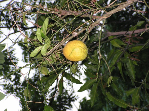 По возвращении я внимательно осмотрела сад. Увы, цитрусы уже кончились. Считается, что цитрусы созревают круглый год, так вот - враки это все, они созревают осенью, висят зимой, а к весне их съедают. Над столовой висел далекий и одинокий мандарин. А неподалеку от моего бунгало на ветке качался гигантский лимон:
