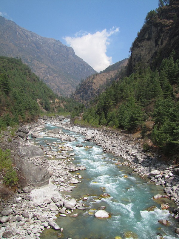 Берега реки Дудх Коси здесь становятся круче, дорога по подвесным мостам переходит то на один, то на другой берег: