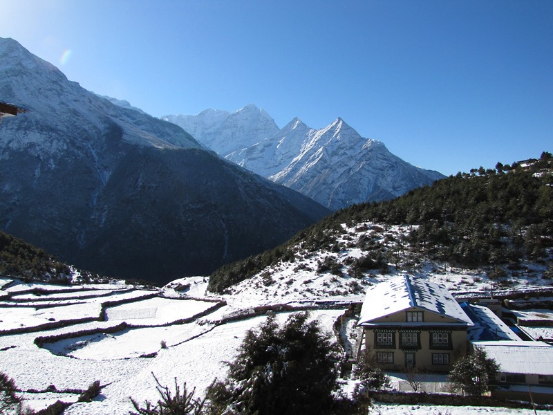 В Тьянгбоче очень мало жилья, всего пять-шесть лоджий. Не случайно многие советовали мне идти дальше и останавливаться в соседних поселках. Осенью так и следует делать, просто нет мест. Но в нашем случае места были, и мы заселились в Thyangboche GH, одноэтажный, относительно новый и, как оказалось, впоследствии все равно загруженном до предела. Здесь прием треккеров поставлен на поток и хозяйство напоминает хорошо отлаженную машину. Управляет этой машиной крепкая и деловитая хозяйка. Есть свои плюсы - еда очень неплохая, в умывальники поутру наливают теплую воду (такого больше не было на треке нигде!). Но гестхаус заполнен всегда, потому что обслуживает группы.