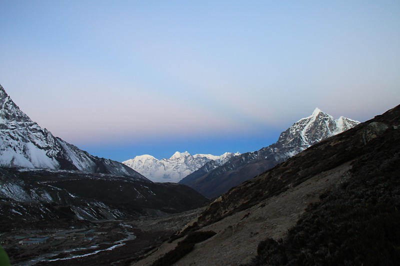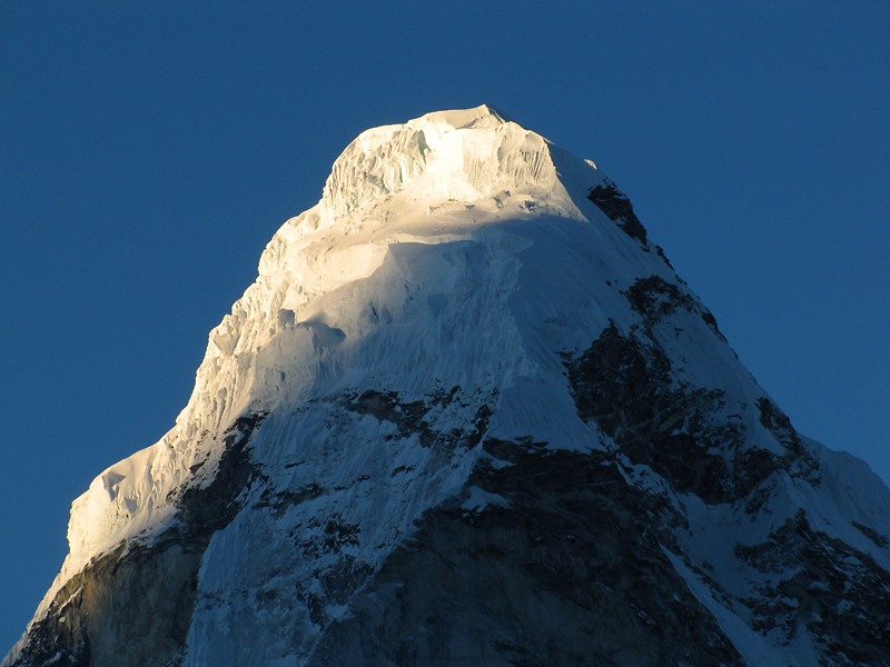 Прямо переда нами стояла Ама Даблам и светилась отраженным светом. К сожалению, от первых рассветных лучей она загорожена более высокой Лхоце.