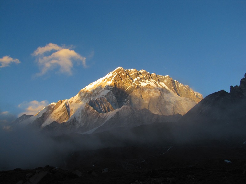 Вечером небо внезапно расчистилось. Если бы мы забрались немного вверх по склону, то увидели бы Эверест на закате. Но тучи разошлись внезапно. Поэтому у нас есть только закатная Нупце.