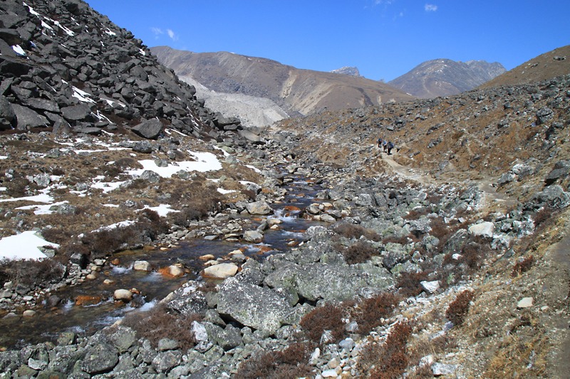 Возле моста через реку стало оживленно и начали попадаться группы треккеров. В окрестностях Гокио видно, что люди все-таки ходят в этот трек и долина не пустая.