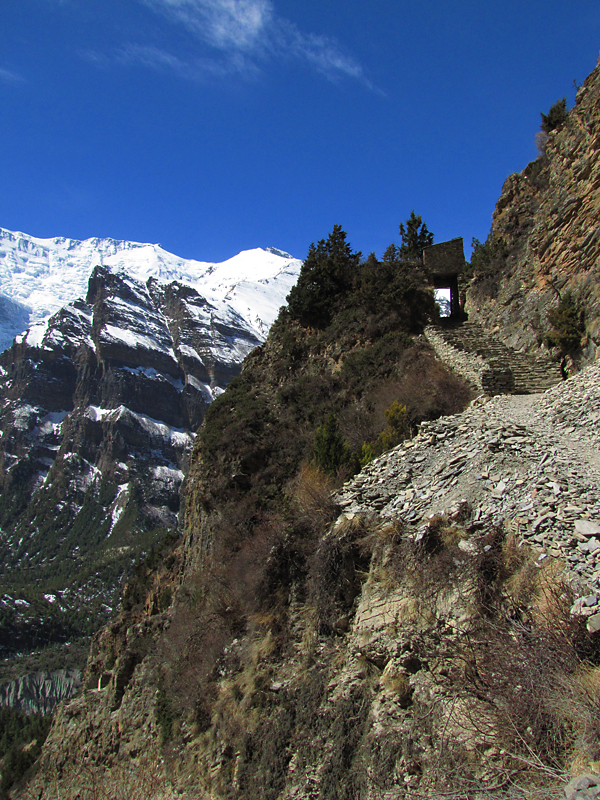 Из Верхнего Писанга до Гьяру дорога сперва пологая, а потом идет крутой, достаточно тяжелый подъем на гору. Этот переход занял у нас два часа с небольшим, включая отдых на многочисленных каменных скамеечках.