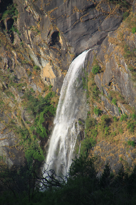 Обедали в Гхасе, после обеда шли еще часа три, пока не устали. В результате не дошли до намеченного поселка Дана и остановились в малюсеньком поселочке Копчепани. Место тихое, приятное, столики на травке и вид на огромный водопад Рупсе Чхахара, что с другой стороны ущелья. Условия там самые простые, комнаты типа сарай, теплая вода дается в ведрах. Но место благостное. Там же нас догнали Наташа и Рома из Хабаровска, так что за ужином мы были в приятной компании.