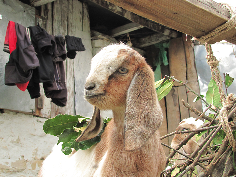 Гордый собой козленок на фоне белья.