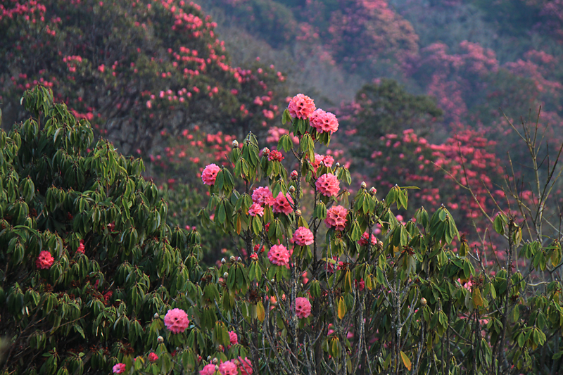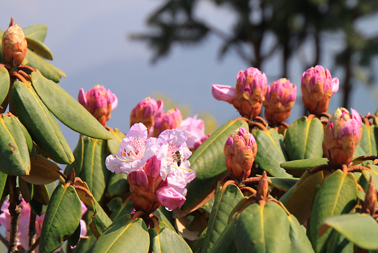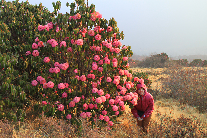 Возле одного из лоджей в поселке увидели сиреневый рододендрон, в лесах почти не встречающийся. Кажется, лишь однажды в ущелье Моди Кхолы я видела подобный оттенок.