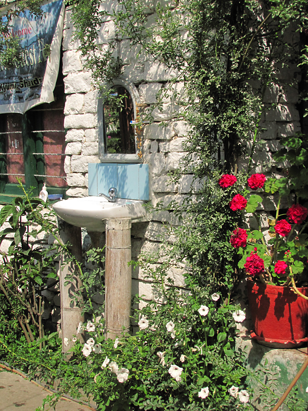 По правому берегу Моди Кхолы на нижней тропе попадаются замечательные феншуйные лоджи. Они почти всегда пустые, потому что самые известные маршруты здесь не проходят. Но когда-нибудь я бы здесь остановилась: много цветов, тепло и как-то так подобраны детали - смотреть одно удовольствие. Вот, например, умывальник на улице.