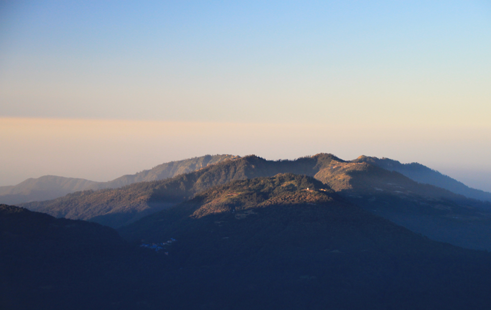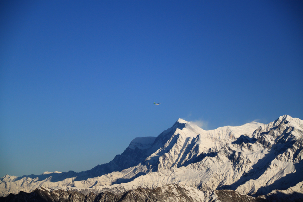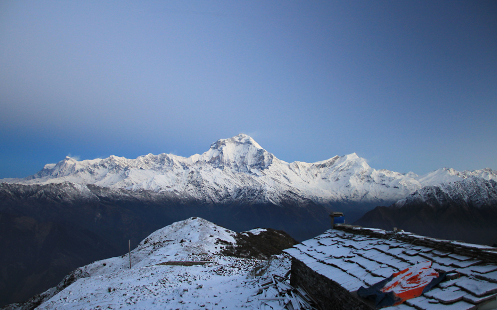 Главная Аннапурна отсюда не видна, только пламенный снежный флаг от нее поднимается за Варахой.
