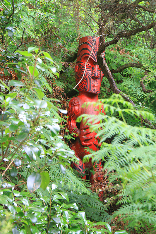 От деревни остался резной дом собраний, дурацкие представления для туристов, на которые мы не пошли, и некоторое количество деревянных статуй, живописно прячущихся в кустах.
