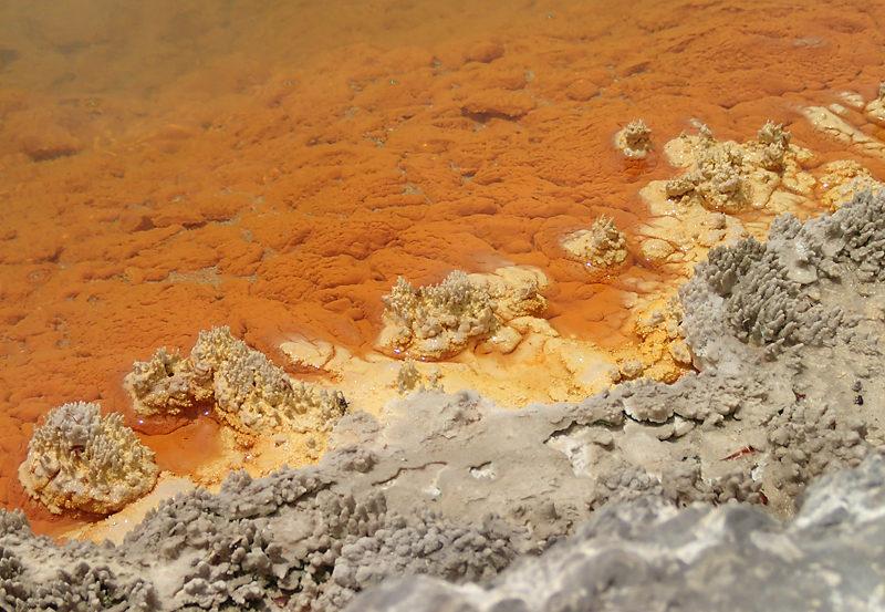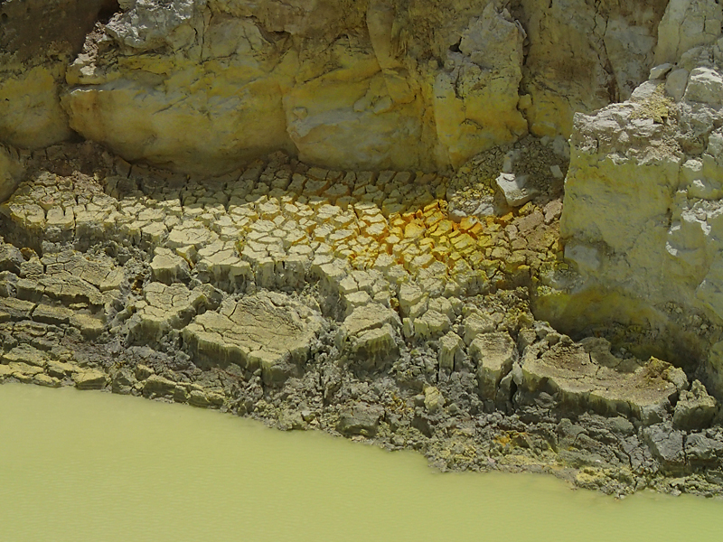 Желтая корочка на берегу - это сера. Наверное, дьяволу она вместо пудры.