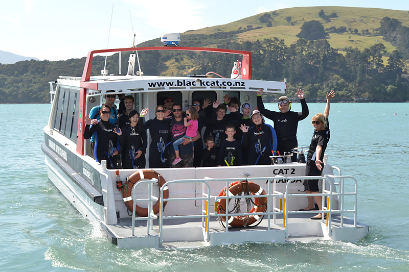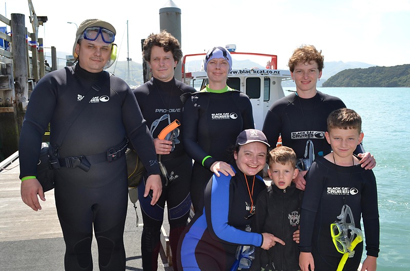 На пристани мы нашли свою компанию, у которой бронировали экскурсию (blackcat.co.nz), и стали одеваться в тесные и неудобные гидрокостюмы. В пещере со светлячками костюмы как-то были помягче, а здесь приходилось расстегивать ворот, чтобы не задыхаться на суше.