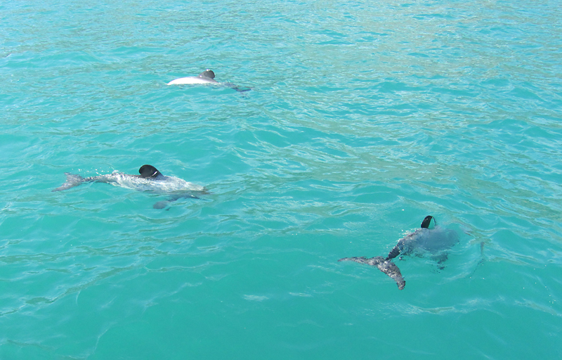 В заливе в большом количестве водятся дельфины Гектора. Они небольшие и общительные: группа дельфинов, если у нее хорошее настроение, может поплавать с группой людей. Нас просили их не трогать, но этого как раз хотелось больше всего. Интересно же, каков дельфин наощупь.